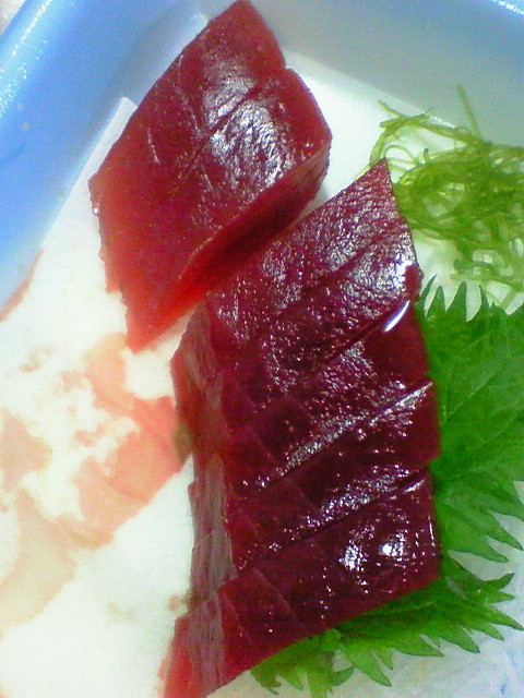 夕べは女房に頂いた芋焼酎と帰り道に近所の魚屋で買ったメジ鮪のお刺身で晩酌