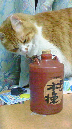 魚のにおいと見た事ない焼酎の徳利にわらびくんも興味深々の様子