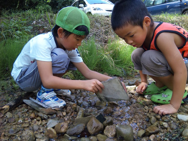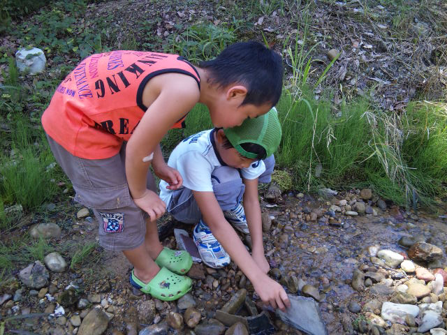 残念ながらビオトープはボランティアの皆さんが草刈作業をしていたので、グランド横のせせらぎでサワガニ獲りに変更