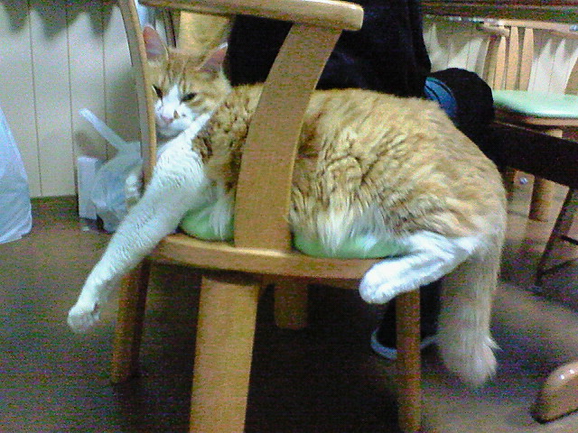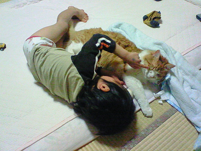 レアルは体操教室から帰ると気持ち良さそうに寝ているわらびにちょっかいだして