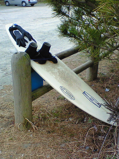 リーシュを柵に巻き付けて板が飛ばないように固定しながら着替えました