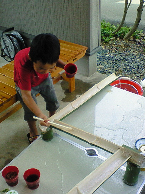 波乗りアフターはレアルの要望で「流しそうめん」を実施!竹やぶに入り手ごろな竹をGETし竹細工、凝っちゃうんですよねー、工作モノって(笑)