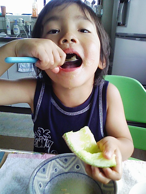 自宅にもどり、そうめんをみんなで食べた後、サーフィン仲間の渥美くんに頂いたマスクメロンをペロリッ、