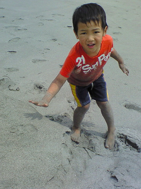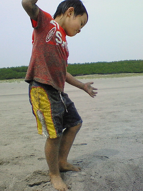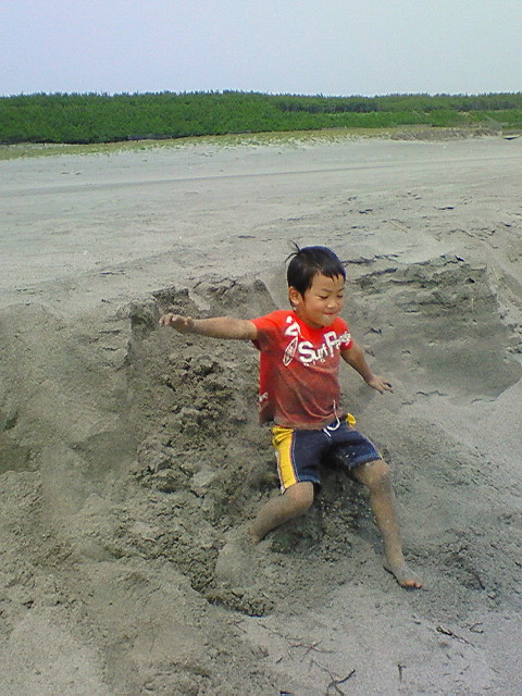 砂浜にできた段差でサーフィンシュミレーション、フロントサイドボトムターン(顔泣いてます・笑)