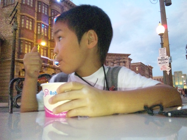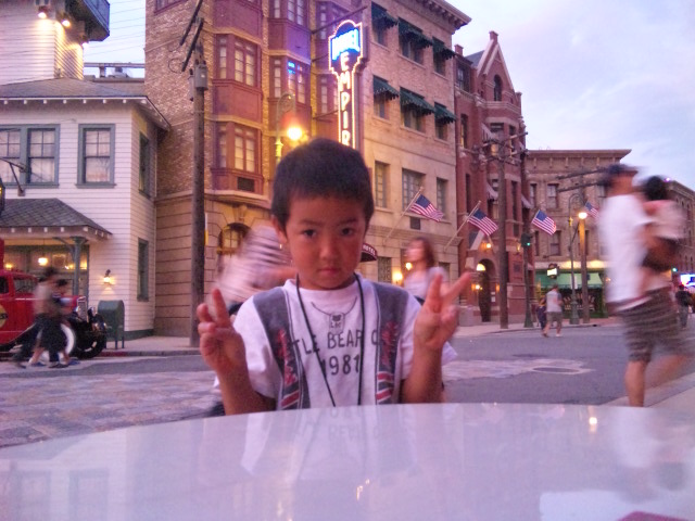 2~3個アトラクション回ったらすでに辺りは薄暗く、パレード開始まで一休み