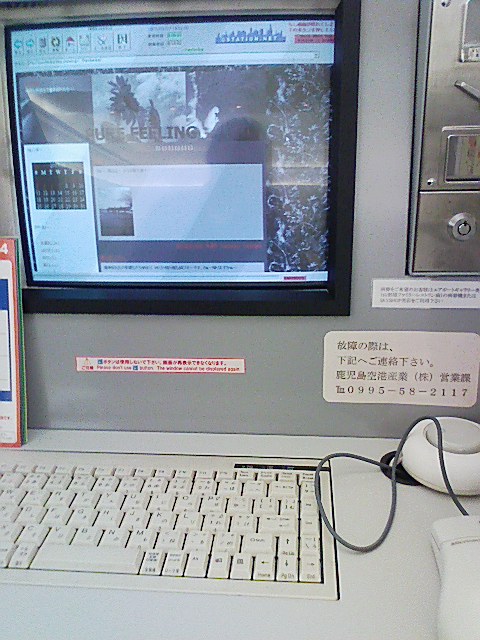 鹿児島空港で足止め、3時間待ちだぁ~、無駄だぁ~、やる事ねぇ~、空港の有料PCでblogがちゃんと更新されてるか確認してますが、モニターが悪くて目がチカチカッ(*_*)するんで速攻撤収致しました凹 にしても、ブロードバンド全盛の時代に1コイン10分しか見れないって、高すぎでしょ、空港さん(-_-メ)しゃ~ないから、タクシーでどっか行くかぁ~?